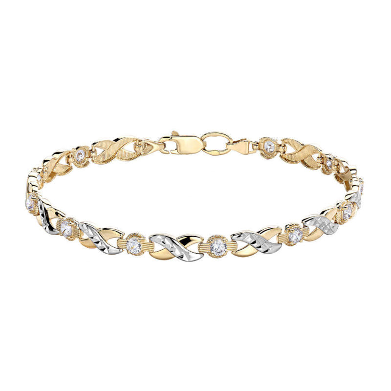 Изящный браслет из желтого золота 585 пробы, украшенный сверкающими фианитами, станет прекрасным дополнением вашего украшения и подчеркнет индивидуальный стиль. Каждое изделие изготовлено с вниманием к деталям и высоким качеством, что гарантирует его долговечность и привлекательный внешний вид. Благодаря классической элегантной стилистике, этот браслет идеально подойдет как для повседневного ношения, так и для особых случаев.