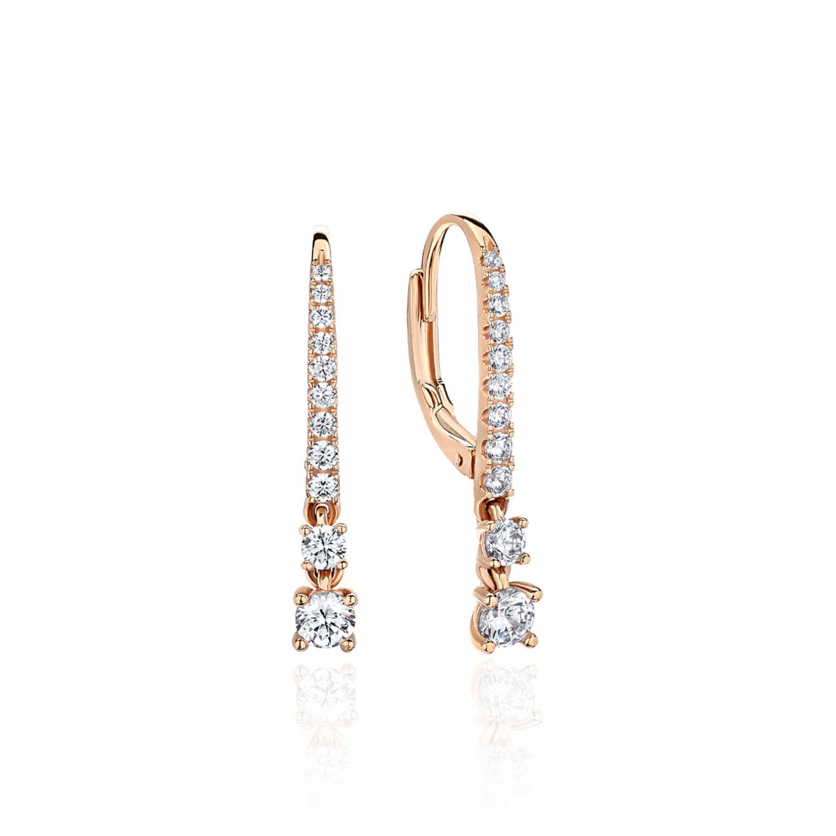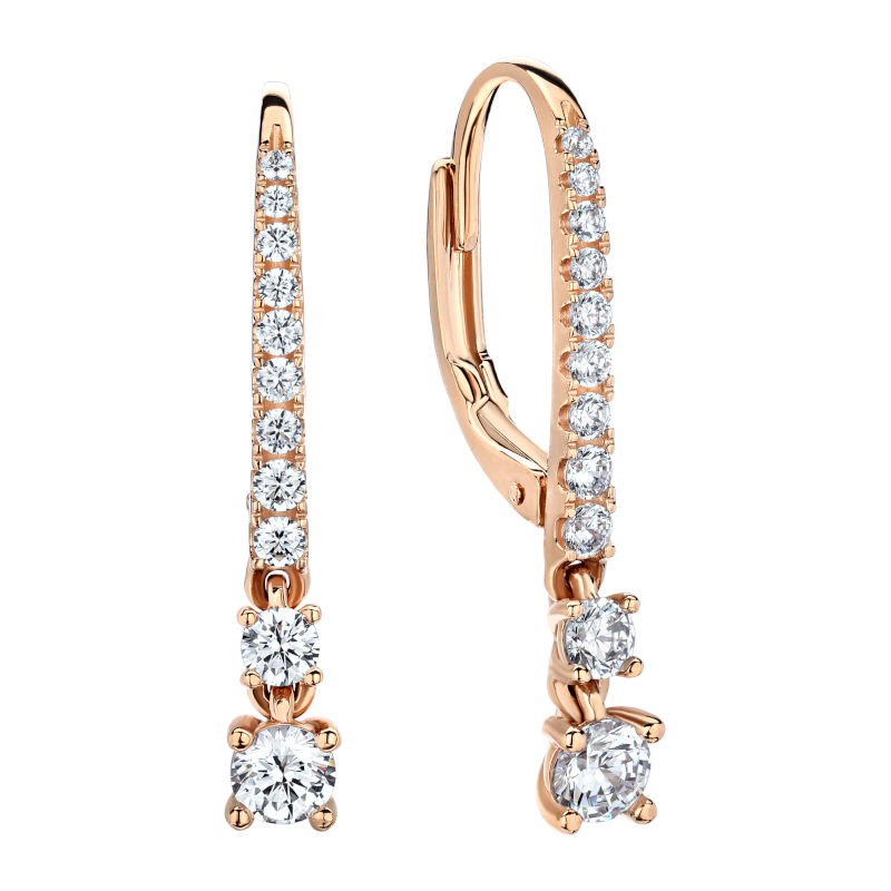 Серьги из красного золота 585 пробы с замком левербэк — украшение в духе актуального минимализма, элегантное и очень комфортное. Замок аккуратно фиксирует серьги в правильном положении, чтобы каскад фианитов идеально украсил мочку уха. Лаконичные серьги с выверенной геометрией сочетаются с любым дресс-кодом и настроением. Носите их, когда хочется быть неотразимой.