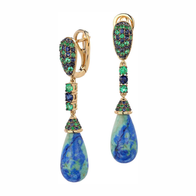 Серьги из желтого золота 585 пробы с сапфирами азуритами и изумрудами 01С5313555-1