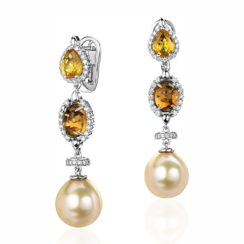 Серьги из белого золота 585 пробы с сапфирами, цитринами, жемчугом и бриллиантами 01С6214795-1
