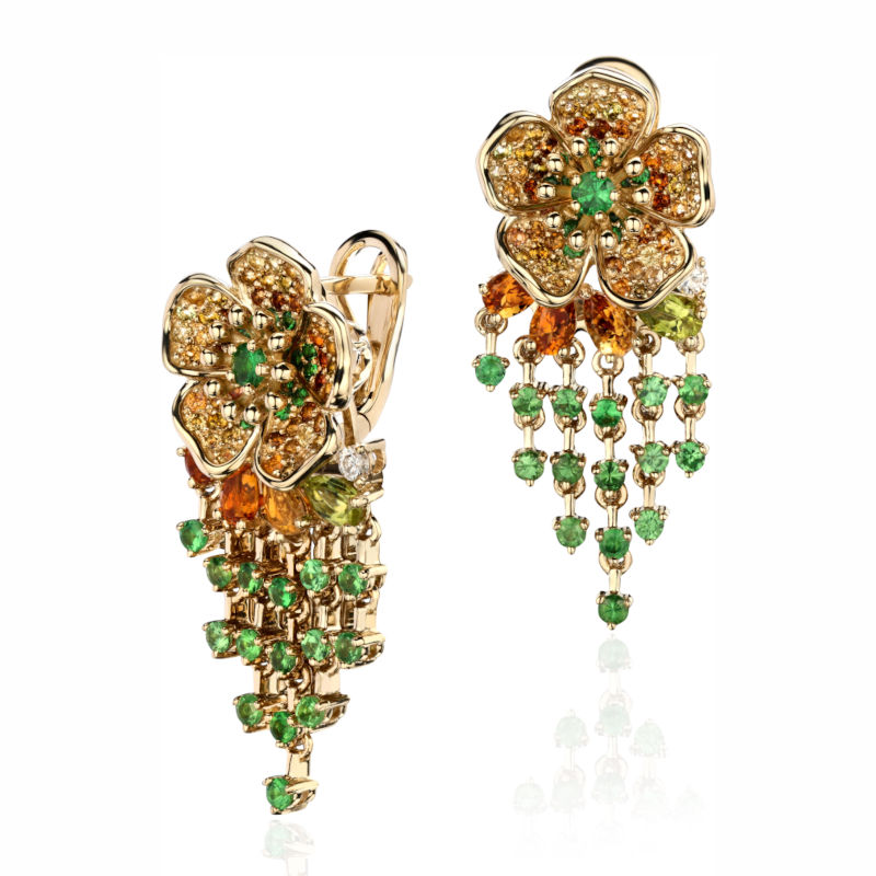 Серьги из желтого золота 585 пробы с турмалинами, хризолитами, цитринами, тсаворитами и бриллиантами 01С6313476-2