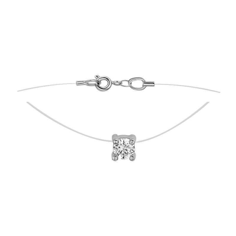 Необычное украшение – колье на леске-невидимке из белого золота 585 пробы с фианитом. Визуальное впечатление отсутствия цепочки придает особую легкость и нежность Вашему образу. Невесомая, будто парящая в воздухе подвеска смотрится оригинально и очень изящно. В украшении много воздуха, свободы. Аксессуар подчеркнет одну из самых притягательных частей - женскую ключицу и плечи.