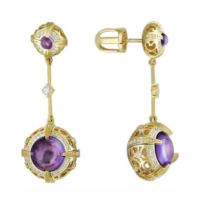 Серьги из желтого золота 750 пробы с аметистами и бриллиантами 01С646018-1