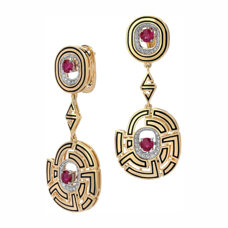 Серьги из комбинированного золота 585 пробы с рубинами, бриллиантами и эмалью 01С6613140ЭЖY-1