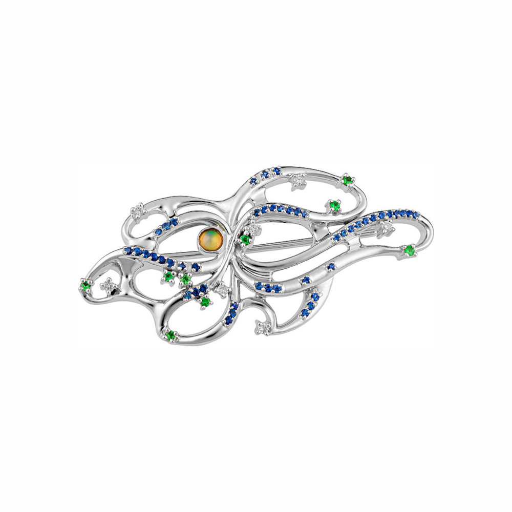 Брошь из белого золота 585 пробы с тсаворитами, опалом, сапфирами и бриллиантами 01Ш620243