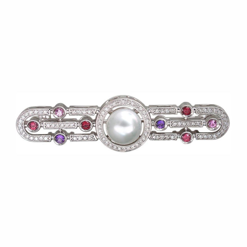 Брошь из белого золота 585 пробы с сапфирами, аметистами, родолитами, жемчугом и бриллиантами 01Ш620180-1