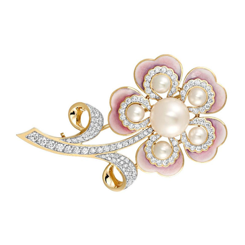 Брошь из желтого золота 585 пробы с жемчугом, бриллиантами и эмалью 01Ш630179ЭЧ-1