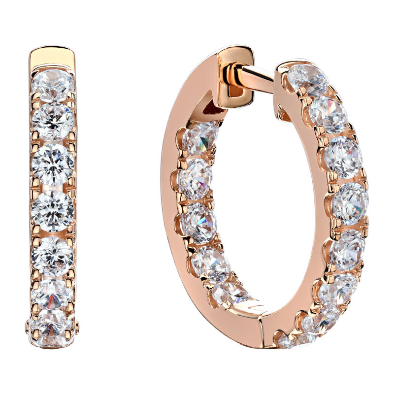 Серьги конго из красного золота 585 пробы с фианитами. Знакомая форма серег инкрустирована 26 вставками. Серьги уменьшенного диаметра, идеально подойдут на каждый день. Вы можете вести активную жизнь - заниматься спортом, ходить на работу, отдыхать на море и не думать о выборе украшения.
