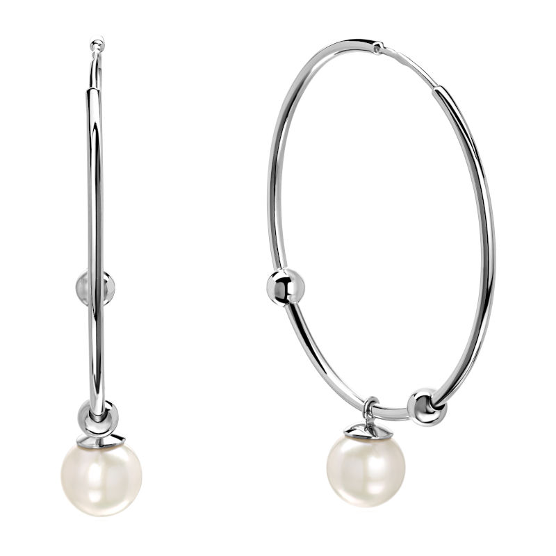 Серьги конго из белого золота 585 пробы. Классическая модель украшена декоративными элементами – неподвижными шариками и подвесками с жемчугом.