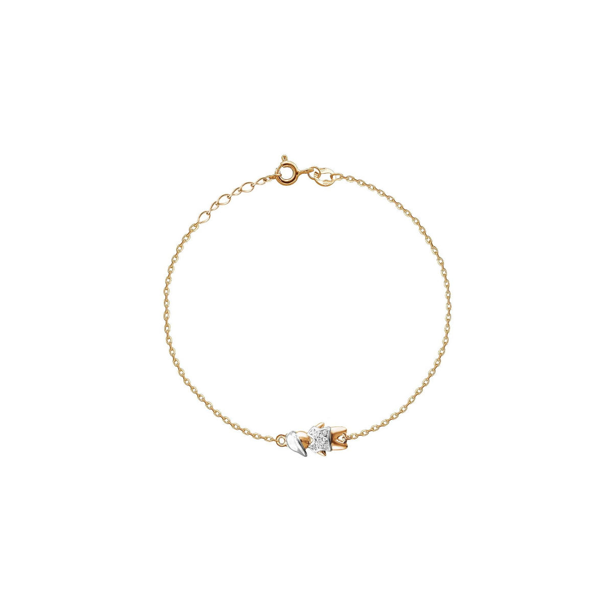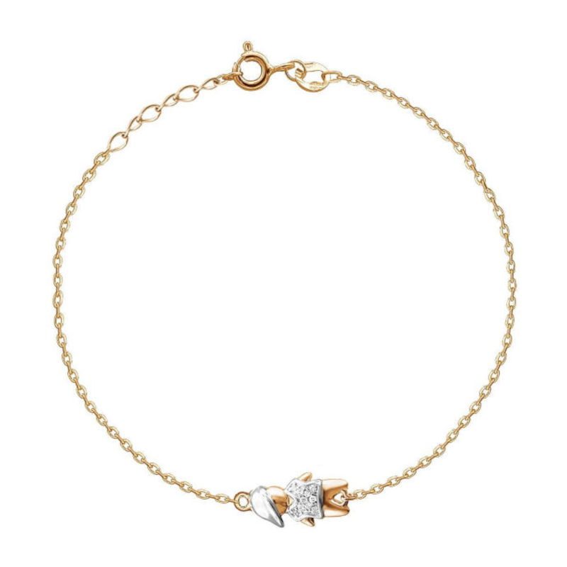 Браслет из красного золота 585 пробы с фианитом. Главным объектом браслета является фигурка "мальчик". Браслет с глубоким смыслом полюбился мамам сыновей. А если у Вас есть брат, то браслет будет напоминать о родном человеке. Мы по особому относимся к предметам, которые хранят воспоминания о близких. Такие вещи мы носим с особой гордостью и трепетом.
