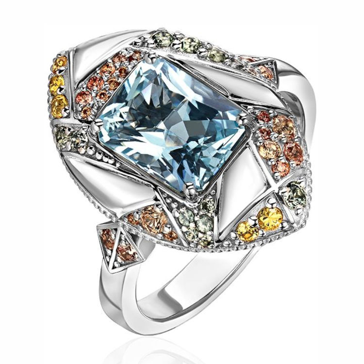 Кольцо из белого золота 585 пробы с аквамарином, сапфирами и бриллиантами 01К6215526-1