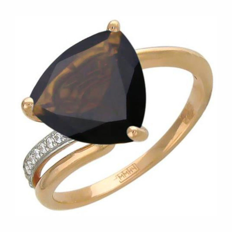 Кольцо из красного золота 585 пробы с раух-топазом и фианитами выполнено из благородного металла, который подчеркнет индивидуальный стиль и элегантность. Особенно эффектно смотрится насыщенный цвет драгоценного камня раух-топаз, его уникальный оттенок создает ощущение загадочности и глубины. Искрящиеся фианиты украшают изделие, добавляя ему дополнительную игру света и изящества. Каждая деталь украшения тщательно проработана, чтобы подчеркнуть красоту и своеобразие дизайна, а качество материалов гарантирует долговечность и стойкость к ежедневному ношению.
