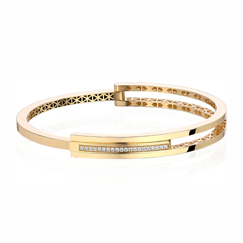 Представляем вашему вниманию жесткий браслет из желтого золота 585 пробы с фианитами из коллекции «Безе» от ювелирного дома «Эстет». Этот элегантный аксессуар создан для современных женщин, которые ценят стиль и высокое качество.
