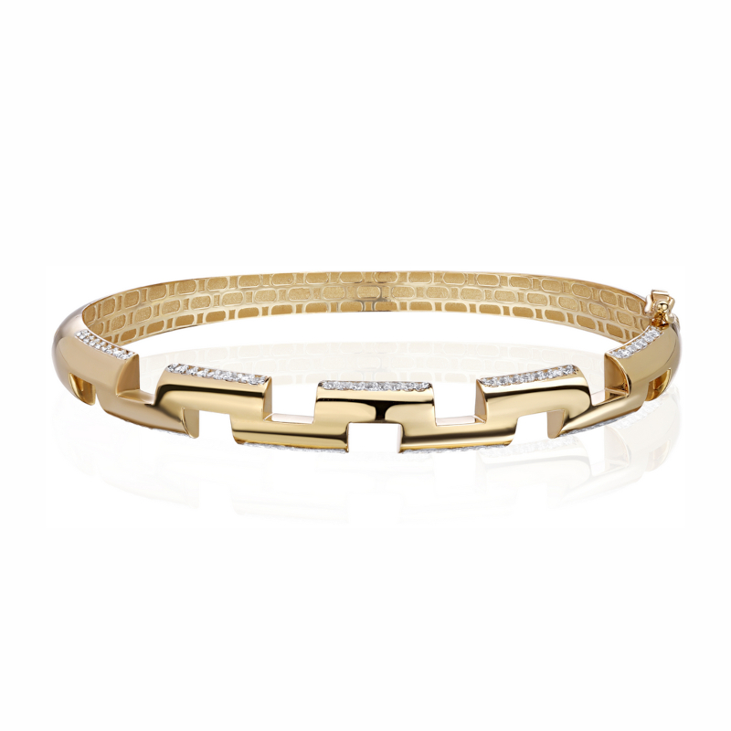 Представляем вашему вниманию жесткий браслет из желтого золота 585 пробы с фианитами из коллекции «Безе» от ювелирного дома «Эстет». Этот элегантный аксессуар создан для современных женщин, которые ценят стиль и высокое качество.