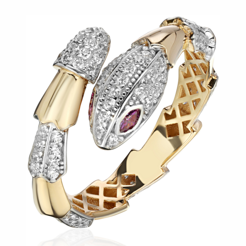 Кольцо из желтого золота 585 пробы с наноизумрудами и фианитами из коллекции Serpenti выполнено из высококачественного золота, обладающего великолепным блеском и долговечностью. Его теплый желтый оттенок гармонично подчеркивает яркость камней и придает украшению особую изысканность и шик. Блеск наноизумрудов и фианитов добавляет кольцу неповторимого сияния, делая его заметным акцентом в любом образе.