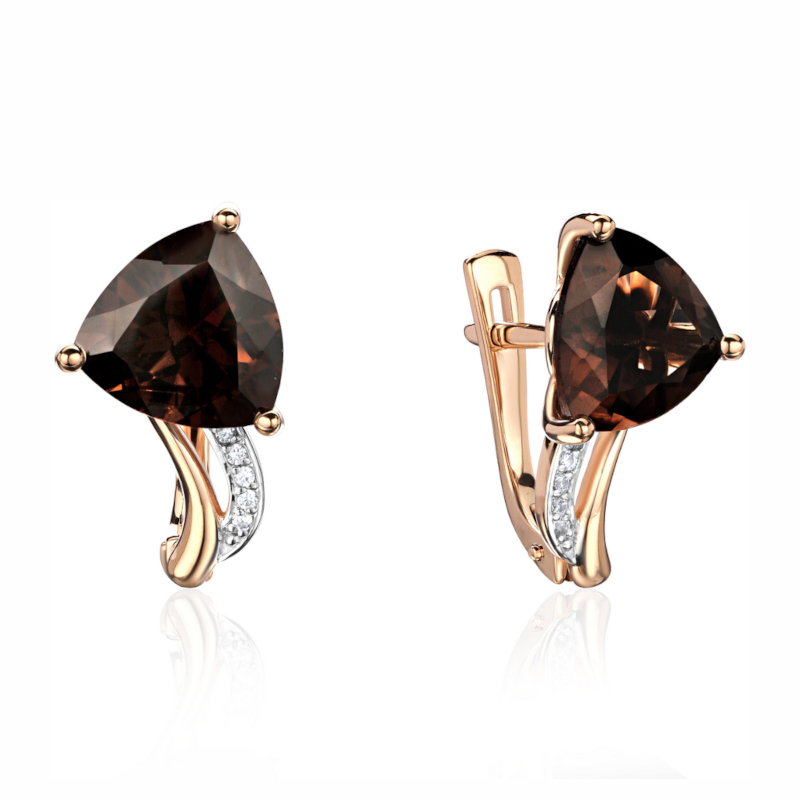 Элегантные серьги выполнены из красного золота 585 пробы, что придает изделию теплый оттенок и надежность. В центре украшения расположены раух-топазы, чьи глубокие насыщенные оттенки подчеркивают выразительность и изысканность дизайна. Финальные акценты дополняют блестящие фианиты, которые создают нежное мерцание и придают комплекту особую привлекательность. Каждая деталь тщательно отработана, что делает эти серьги идеальным украшением для любого случая.