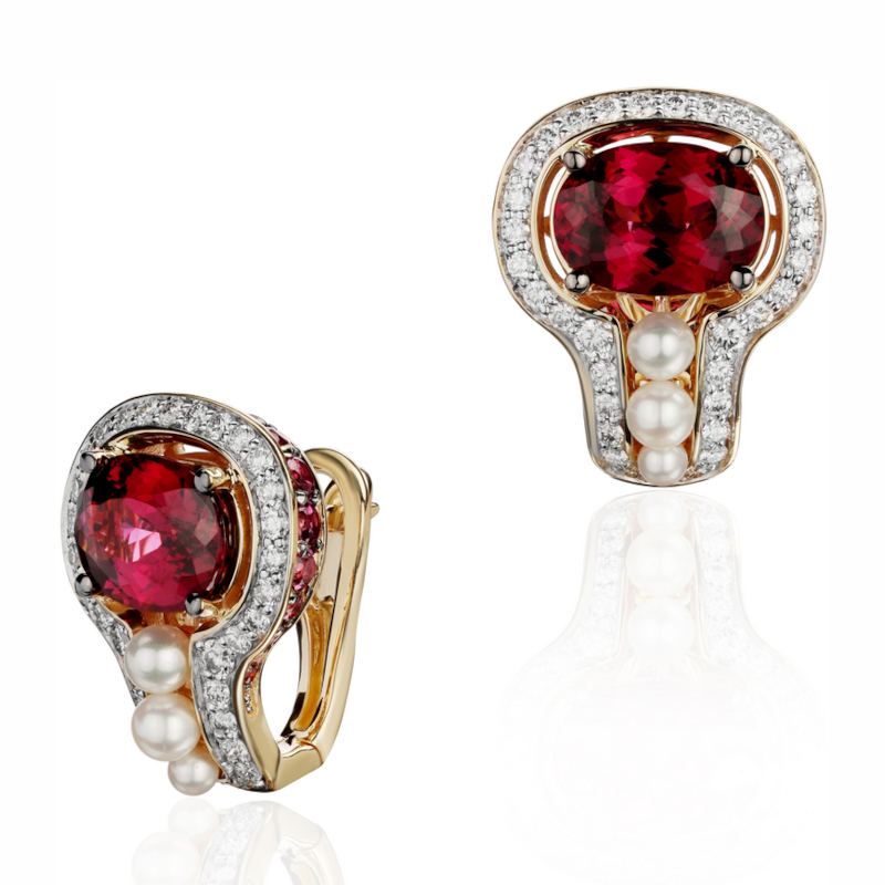 Серьги из желтого золота 585 пробы с жемчугом, бриллиантами и родолитами 01С6311865-3
