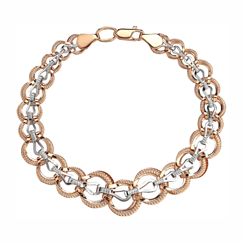 Браслет 01Б063162 из двух видов золота 585 пробы — белого и красного — станет ярким акцентом в любом образе. Его универсальный дизайн легко сочетается с различными стилями одежды. Надежный замок обеспечивает безопасность и удобство при ношении.