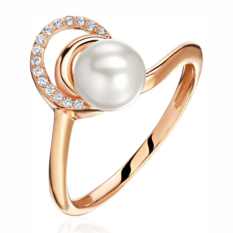 Кольцо из красного золота 585 пробы с фианитами и жемчугом 01К3115338-1