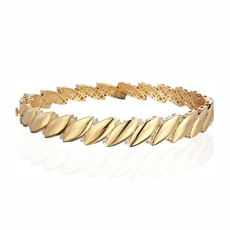 Представляем вашему вниманию жесткий браслет из желтого золота 585 пробы с фианитами из коллекции «Безе» от ювелирного дома «Эстет». Этот элегантный аксессуар создан для современных женщин, которые ценят стиль и высокое качество.