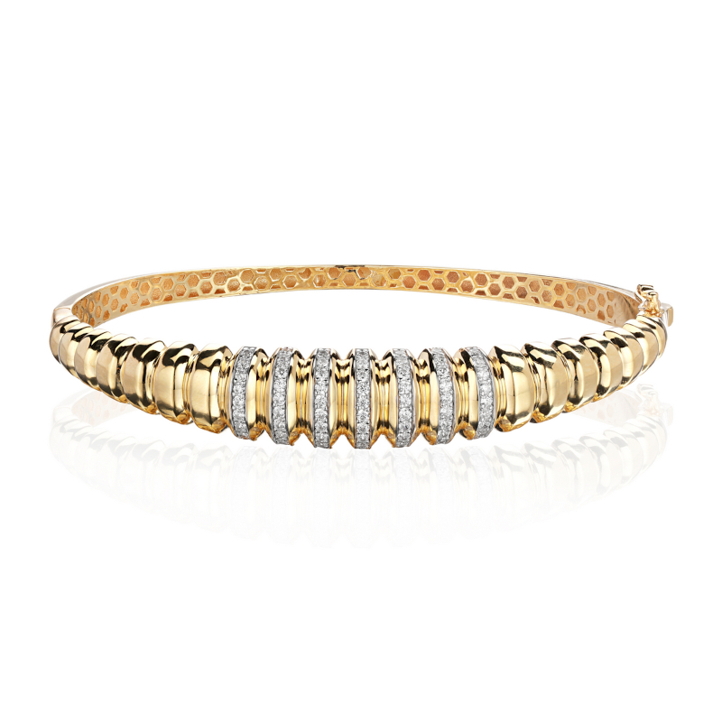 Представляем вашему вниманию жесткий браслет из желтого золота 585 пробы с фианитами из коллекции «Безе» от ювелирного дома «Эстет». Этот элегантный аксессуар создан для современных женщин, которые ценят стиль и высокое качество.