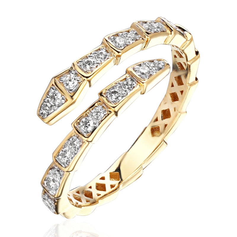 Кольцо из желтого золота 585 пробы с фианитами из коллекции Serpenti создано для тех, кто ценит утонченную элегантность и глубокий символизм. Желтое золото обладает тёплым, насыщенным блеском, подчёркивающим достоинства ювелирного изделия и придающим ему особый шарм. Надёжное и прочное, оно прекрасно подчеркивает красоту фианитов, обеспечивающих яркий и искрящийся блеск, словно живое пламя, освещающее каждый ваш образ.