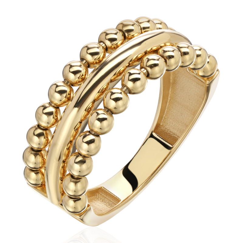 Кольцо из желтого золота 585 пробы без вставок выполнено в рамках коллекции "Golden pearl". Это изделие подчеркнет утонченность и изысканность любой женщины, ценящей качественные украшения. Каждое кольцо поставляется в подарочной коробке и фирменном бумажном пакете, что делает его отличным подарком для близкого человека или приятным подарком для себя. Производство осуществляется в нашем ювелирном доме "Эстет", где используются только высококачественные материалы и строгие стандарты изготовления. Коллекция "Golden pearl" получила свое название не случайно — модели этой серии ассоциируются с роскошным жемчугом. В них сочетается объемные формы, подвижность элементов и легкое ощущение воздушности. Каждое «золотое жемчужное» кольцо содержит шарики, аккуратно собранные на золотую проволоку, что создает эффект подвижных бусин. Такая подвижность добавляет изделию живости и придает ему особую привлекательность, даря его обладательнице ощущение спокойствия и уюта — эффект антистресс. В дизайне особенно проработано сочетание гладких, ровных поверхностей и золотых шариков, создающих яркий и элегантный контраст. Это делает украшение запоминающимся и подчеркнет индивидуальность своей обладательницы. Такой стильный аксессуар привлечет множество восхищенных взглядов и станет любимым элементом повседневного или праздничного образа.