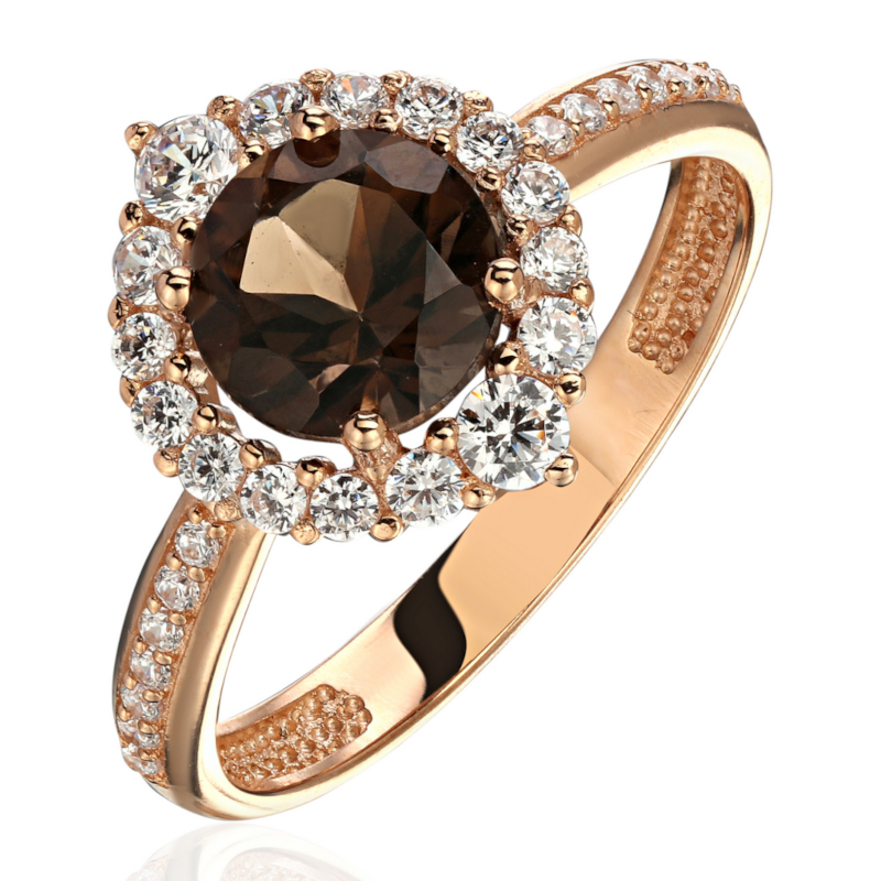 Кольцо изготовлено из красного золота 585 пробы, что гарантирует его долговечность и красивый, насыщенный оттенок. Эта модель из коллекции "New colour" отличается современным и ярким дизайном, подчеркивающим индивидуальность и статус владельца. В центре кольца расположен раух-топаз – камень с глубокими, насыщенными оттенками, за счет которых создается особая атмосфера загадочности и элегантности. Вокруг раух-топаза размещены искусственные фианиты, придающие украшению блеск и завершенность. Высокое качество конструкции и использование проверенных материалов делают это кольцо не только красивым украшением, но и надежным изделием на долгие годы.