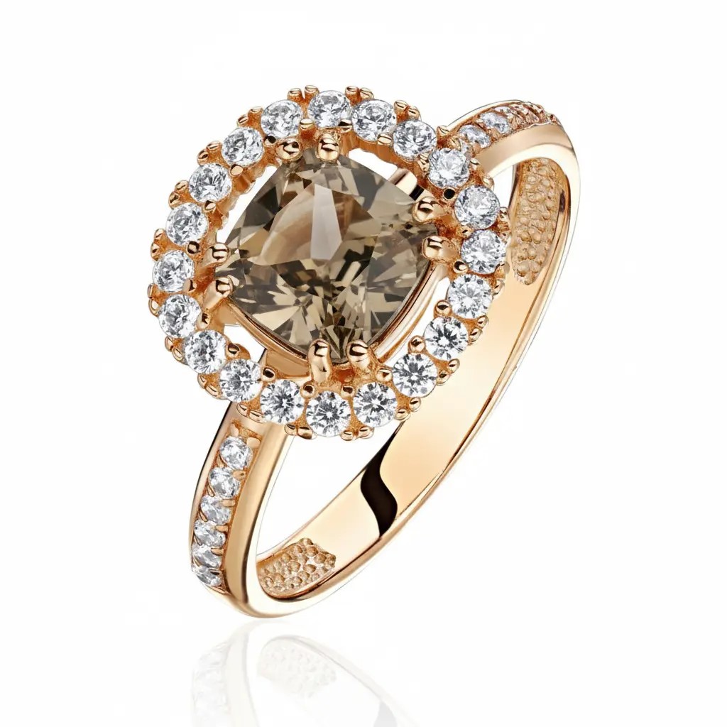 Кольцо изготовлено из красного золота 585 пробы, что гарантирует его долговечность и красивый, насыщенный оттенок. Эта модель из коллекции "New colour" отличается современным и ярким дизайном, подчеркивающим индивидуальность и статус владельца. В центре кольца расположен раух-топаз – камень с глубокими, насыщенными оттенками, за счет которых создается особая атмосфера загадочности и элегантности. Вокруг раух-топаза размещены искусственные фианиты, придающие украшению блеск и завершенность. Высокое качество конструкции и использование проверенных материалов делают это кольцо не только красивым украшением, но и надежным изделием на долгие годы.