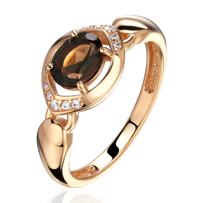 Кольцо изготовлено из красного золота 585 пробы, что гарантирует его долговечность и красивый, насыщенный оттенок. Эта модель из коллекции "New colour" отличается современным и ярким дизайном, подчеркивающим индивидуальность и статус владельца. В центре кольца расположен раух-топаз – камень с глубокими, насыщенными оттенками, за счет которых создается особая атмосфера загадочности и элегантности. Вокруг раух-топаза размещены искусственные фианиты, придающие украшению блеск и завершенность. Высокое качество конструкции и использование проверенных материалов делают это кольцо не только красивым украшением, но и надежным изделием на долгие годы.