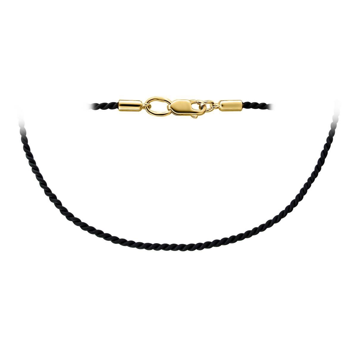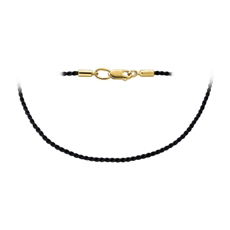 Колье на основе шелкового шнура с замком из желтого золота 585 пробы. Особое украшение, которое полюбится и мужчинам и женщинам. Изделия из этого материала подходят для повседневной носки. Мягкая основа не царапает и не натирает кожу, не цепляется за одежду и волосы. Сочетайте грубые и нежные фактуры, дополняйте шнур различными подвесками и украшение будет каждый раз новым. Ширина шнура: 1,5 мм.