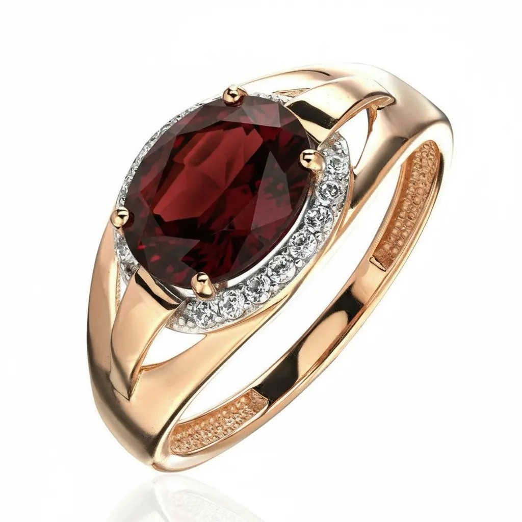 Кольцо из красного золота 585 пробы украшено ярким гранатом и мягким сиянием фианитов, создавая элегантное и выразительное сочетание. Каждая деталь изделия тщательно продумана, что делает его универсальным украшением для любого образа. Надев такое кольцо, вы подчеркнете свою индивидуальность и утонченный вкус.