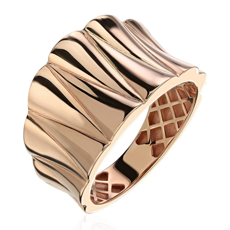 Ультрамодное массивное кольцо без ювелирных вставок из коллекции «Безе» впечатляет благородным медным отливом красного золота 375 и рельефной формой. Каплевидные элементы, расширяющиеся к верхней части ободка, сглаживают внушительные объемы изделия и подчеркивают глубину света и тени. Что-то в этом кольце напоминает песчаные дюны в полдень и убегающие за горизонт пшеничные поля, открывая простор для самых смелых мечтаний. Возможно, так начинается путь к своему счастью.