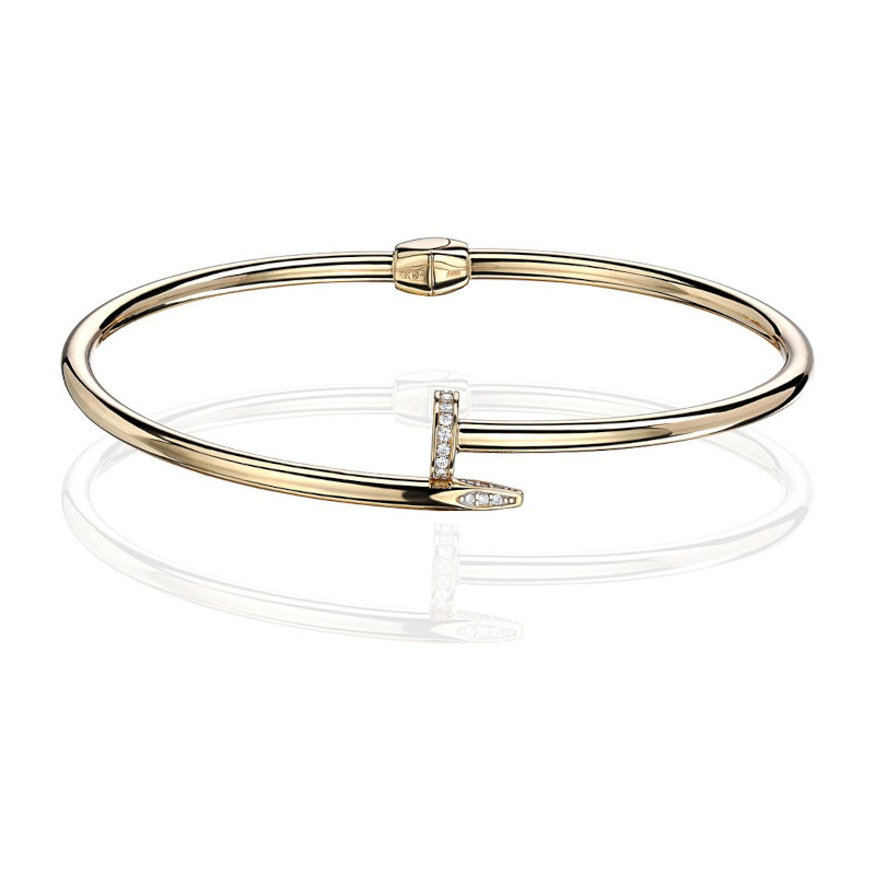 Браслет "Гвоздь" выполнен из желтого золота 375 пробы, что гарантирует его надежность и красивый яркий оттенок. Его оригинальный дизайн в виде гвоздя придает украшению особый стиль и изысканность, подчеркивая индивидуальность владельца. Украшен браслет сверкающими фианитами, которые добавляют ему искрящиеся блики и создают эффект роскоши и праздничности. Такой аксессуар отлично сочетает в себе минимализм и строгую эстетику, подчеркивая современный подход к украшениям.