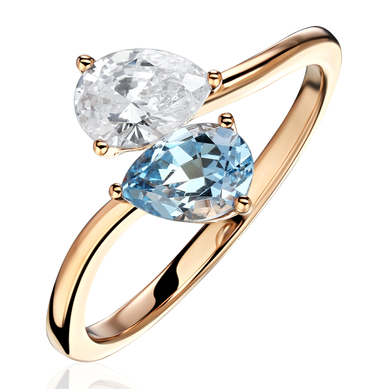 В этом кольце из красного золота 585 пробы прекрасно все — минималистские закрепки с тремя лапками, изящный тонкий ободок, грушевидная огранка камней и абсолютная гармония прозрачного фианита и голубой синтетической шпинели. Дизайн украшения символизирует историю двоих влюбленных, которые шли друг к другу разными путями и. наконец, слились в едином поцелуе. Два «я» превратилось в «мы». И эти двое вместе навеки: как небо и облака, вода и воздух, молодость и первая любовь.