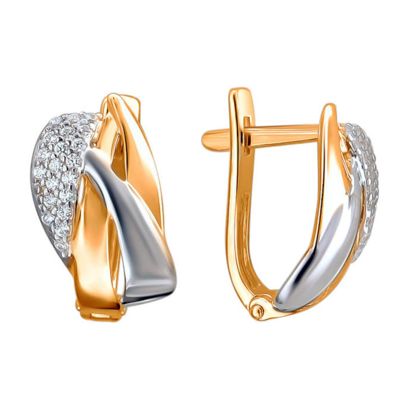 Серьги из красного золота 585 пробы с фианитами. Надежный английский замком привычен и любим многими женщинами. Это базовое украшение с элегантным дизайном, очень комфортное в повседневной носке. Фианит всего лишь был должен заменить алмаз для лабораторий. А получилось, что стал незаменимым атрибутом ювелирных украшений. Самыми популярными являются, конечно же, прозрачные фианиты. Они гармонируют совершенно с любым металлом, с любой формой изделия. Конструкция замка скроет дырку от прокола.
