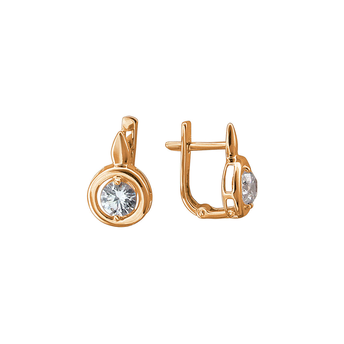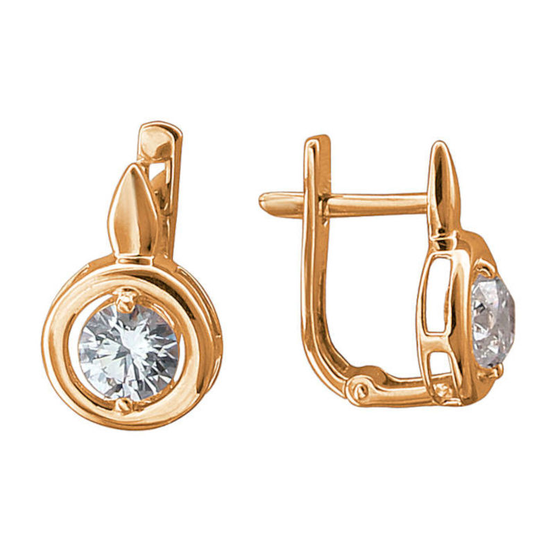 Серьги из красного золота 585 пробы с фианитами. Надежный английский замком привычен и любим многими женщинами. Это базовое украшение с элегантным дизайном, очень комфортное в повседневной носке. Фианит всего лишь был должен заменить алмаз для лабораторий. А получилось, что стал незаменимым атрибутом ювелирных украшений. Самыми популярными являются, конечно же, прозрачные фианиты. Они гармонируют совершенно с любым металлом, с любой формой изделия. Конструкция замка скроет дырку от прокола.