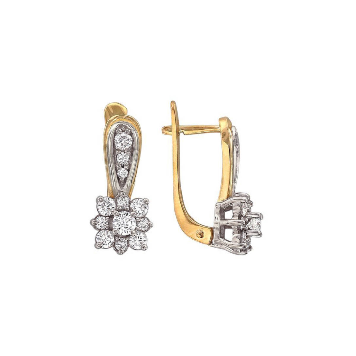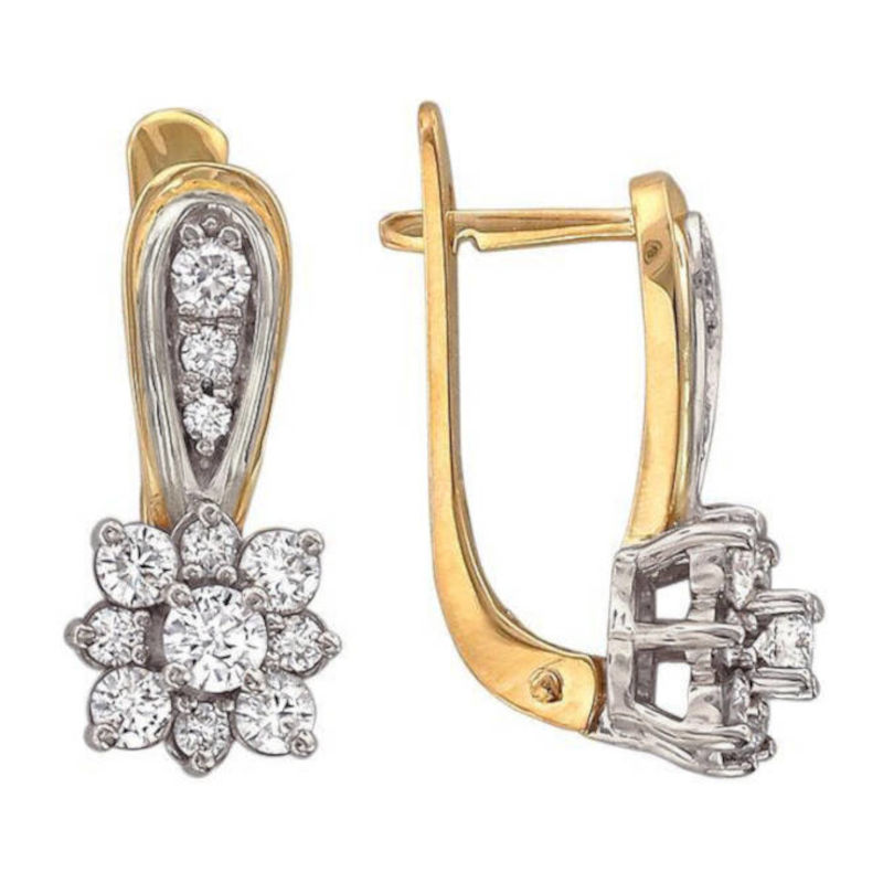 Серьги из двух цветов золота 585 пробы с фианитами. Гармоничное сочетание красного и белого цветов металла, надежный английский замком привычен и любим многими женщинами. Это базовое украшение с элегантным дизайном, очень комфортное в повседневной носке. Фианит всего лишь был должен заменить алмаз для лабораторий. А получилось, что стал незаменимым атрибутом ювелирных украшений. Самыми популярными являются, конечно же, прозрачные фианиты. Они гармонируют совершенно с любым металлом, с любой формой изделия. Конструкция замка скроет дырку от прокола.