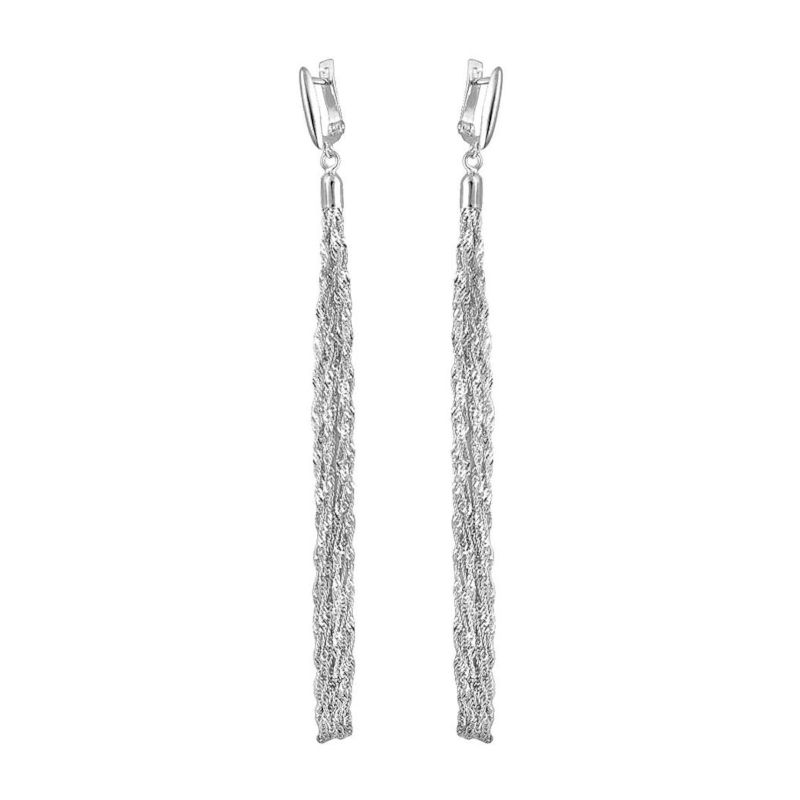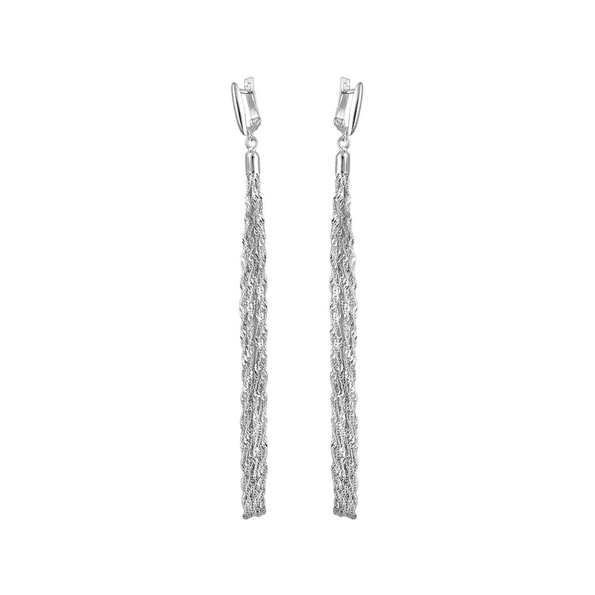 Серьги "кисти" из белого золота 585 пробы без вставок с надежным английским замком привычны и любимы многими женщинами. Множество длинных цепей с алмазными гранями раскачиваются от Ваших движений, передавая игру и блеск металла. Конструкция замка скроет дырку от прокола.