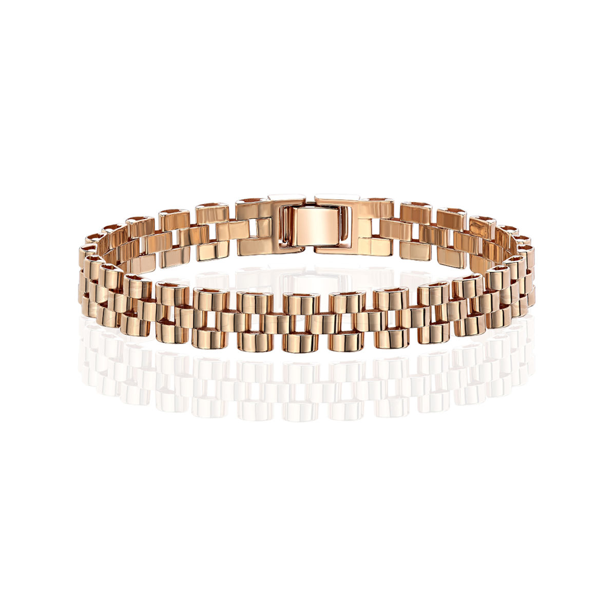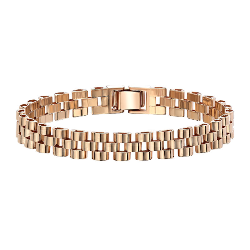 Браслет из красного золота 585 пробы без вставок выполнен по штампованной технологии, которая обеспечивает легкость и комфорт при ношении, сохраняя при этом значительный внешний объем украшения. Его изящный дизайн подчеркнет индивидуальность и станет достойным дополнением любого образа. Зеркальный блеск и насыщенный цвет металла привлекают внимание и придают особый шарм, делая изделие заметным и выразительным.