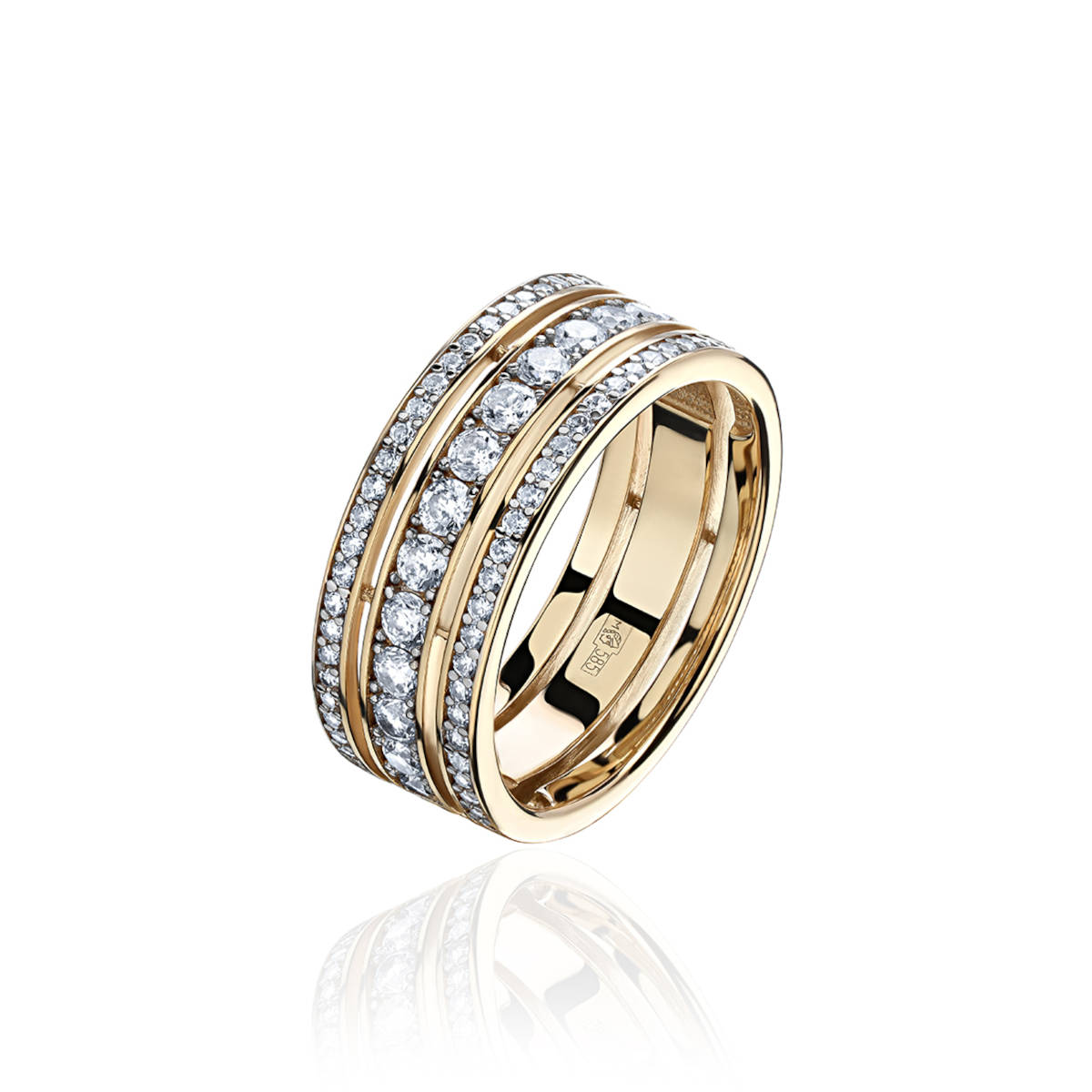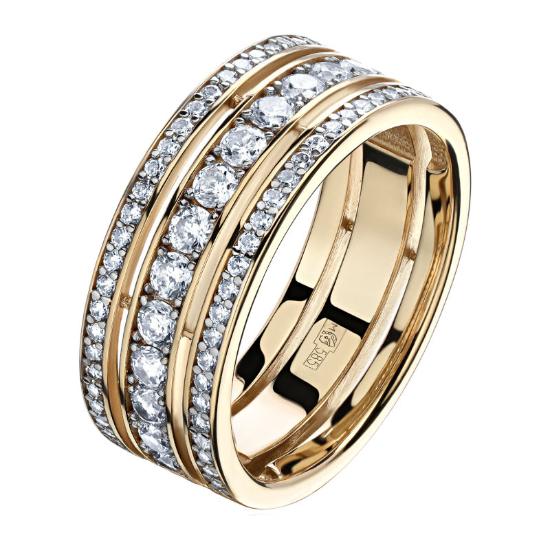 Кольцо из желтого золота 585 пробы с фианитами из коллекции "Стиль города". Дизайнеры вдохновились городскими дорогами, развязками, ночными фонарями, мостами и строительными конструкциями. Поэтому в коллекции много линий, полос, камней. Городской стиль casual одинаково нравится людям разного возраста и достатка. Он позволяет сформировать полноценный образ людям с любой фигурой и ростом. Особенностью городского стиля в украшениях будет то, что их можно носить каждый день, независимо от дресс-кода или планируемого мероприятия. В меру сдержанный и расслабленный стиль мегаполиса, который объединяет в себе комфорт и элегантность.