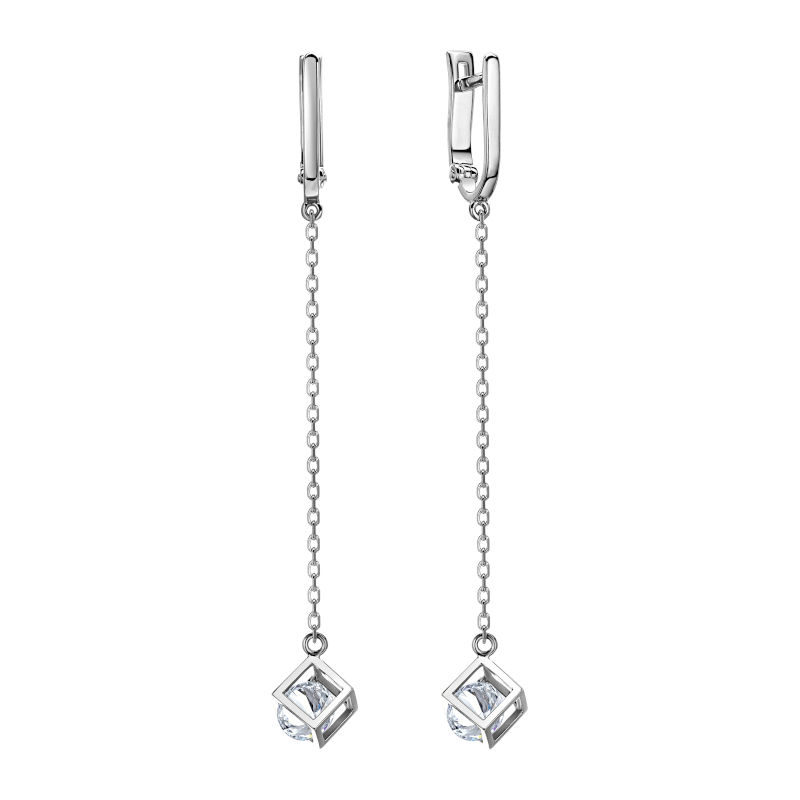 Серьги из белого золота 585 пробы с фианитами. Надежный английский замком привычен и любим многими женщинами. Это базовое украшение с элегантным дизайном, очень комфортное в повседневной носке. Фианит всего лишь был должен заменить алмаз для лабораторий. А получилось, что стал незаменимым атрибутом ювелирных украшений. Самыми популярными являются, конечно же, прозрачные фианиты. Они гармонируют совершенно с любым металлом, с любой формой изделия. Конструкция замка скроет дырку от прокола.