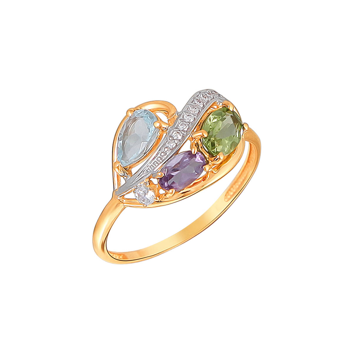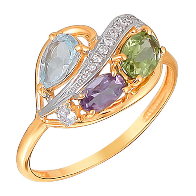 Кольцо из красного золота 585 пробы с хризолитом, фианитом, топазом и аметистом 01К3111146-6
