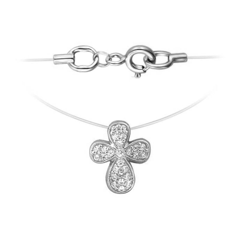 Необычное украшение – колье на леске-невидимке из белого золота 585 пробы с фианитами. Визуальное впечатление отсутствия цепочки придает особую легкость и нежность Вашему образу. Невесомая, будто парящая в воздухе подвеска смотрится оригинально и очень изящно. В украшении много воздуха, свободы. Аксессуар подчеркнет одну из самых притягательных частей - женскую ключицу и плечи.