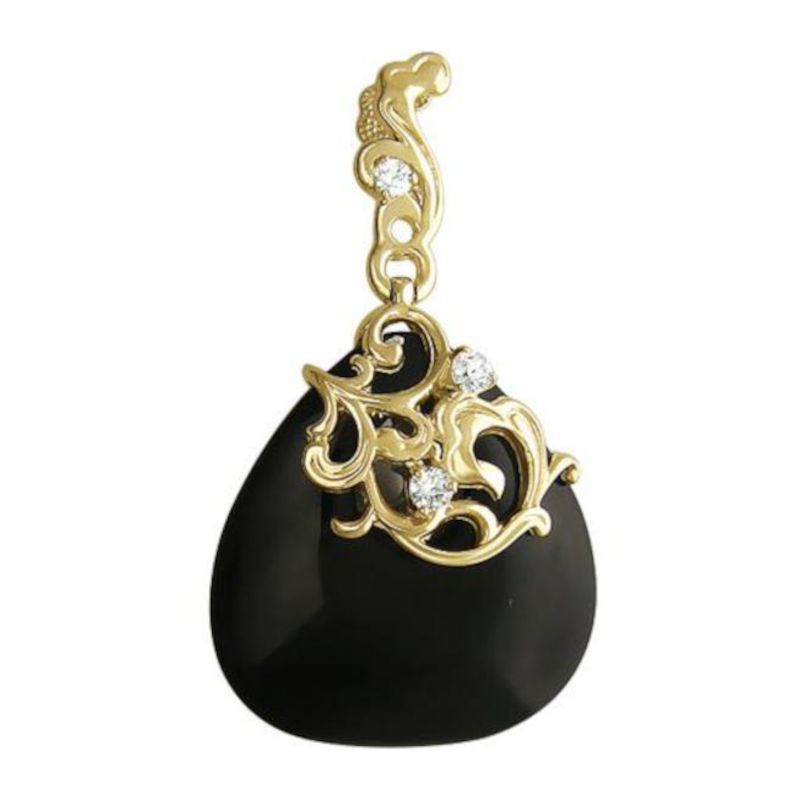 Подвеска из желтого золота 585 пробы с черным агатом и фианитами. Натуральные камни в обрамлении драгоценного металла несут в себе энергию, статус, цветотерапию. Украшение является инвестицией, так как вместе с драгоценным металлом используются натуральные вставки.