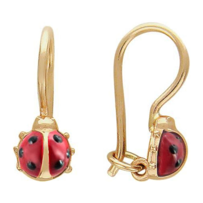 Детские серьги из красного золота 585 пробы с эмалью. Для детей мы предлагаем все самое лучшее и безопасное. Детские серьги не имеют острых деталей, а замок надежно удерживает их в детских ушках. Родители могут быть спокойны за своих маленьких красавиц. Не стоит волноваться за надежность замка петля. Серьги находятся в ухе и не выпадают за счет баланса сережек. Загибаясь петлей, дужка опускается ниже мочки. Массы металла с обратной стороны уха достаточно, чтобы удерживать лицевую композицию. Имеется стопорный крючок, удерживающий петлю от расстегивания. Серьги легко надеваются, подходят для любой мочки уха.