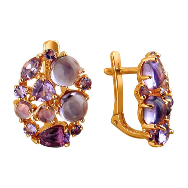 Серьги из красного золота 585 пробы с аметистами. Изюминка украшения в том, что использованы аметисты с разной огранкой. У каждой модницы в шкатулке с украшениями должны быть натуральные камни. Они несут в себе энергию, статус, цветотерапию. В обрамлении благородного металла такие украшения подарят эркие эмоции. Украшение является инвистицией, так как вместе с драгоценным металлом используются натуральные вставки.