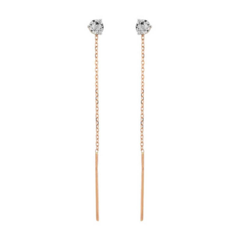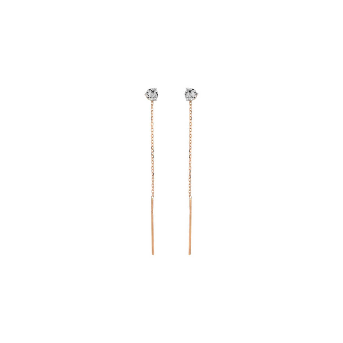 Тоненькие и невесомые серьги из двух цветов золота 585 пробы с бриллиантами. Идеальное сочетание красного и белого цветов металла. А особая технология позволит сиять бриллианту еще больше. Иллюзорная оправа визуально увеличивает размер прозрачного бриллианта. Серьги привлекут внимание к изяществу Вашей шеи и будут отлично смотреться с любым нарядом. Удобная конструкция без замков. Серьги находятся в ухе и не выпадают за счет баланса сережек. Массы металла с обратной стороны серьги достаточно, чтобы удерживать лицевую композицию. Серьги легко надевать, подходят для любой мочки уха. В украшении много воздуха и движения.
