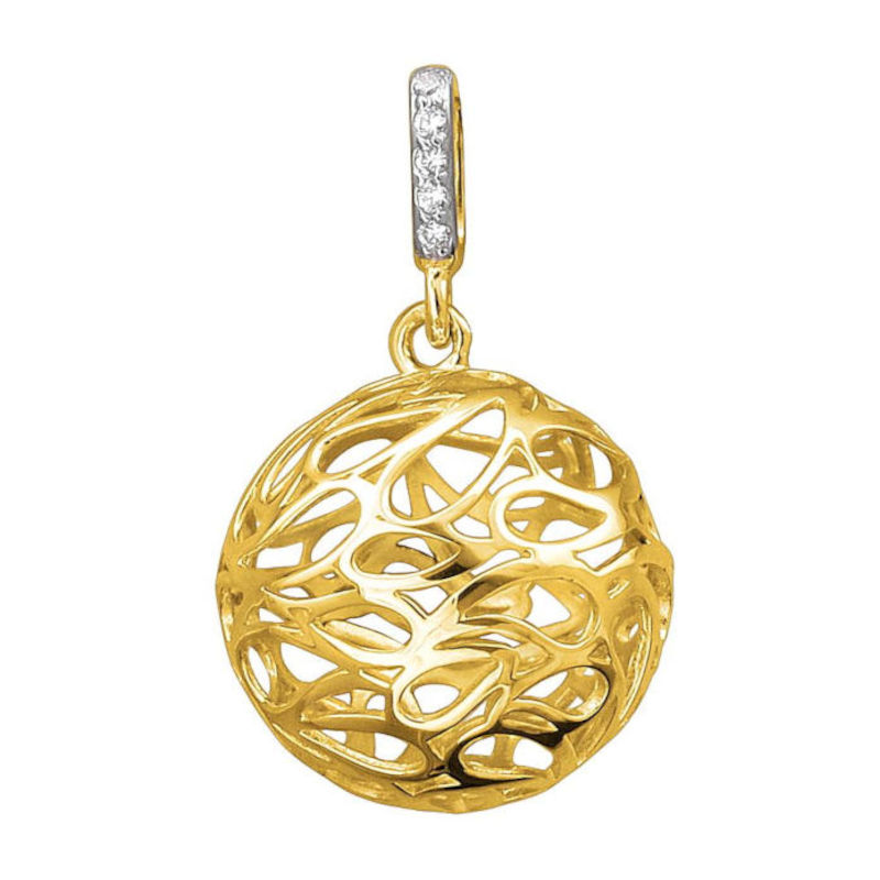 Подвеска из желтого золота 585 пробы с фианитами. Поверхность шара выполнена в виде узора пейсли. Пейсли или "турецкий огурец" — это узор в виде капли с загнутым вверх концом. Узор пейсли является символом жизни и плодородия. Диаметр шара: 15мм.
