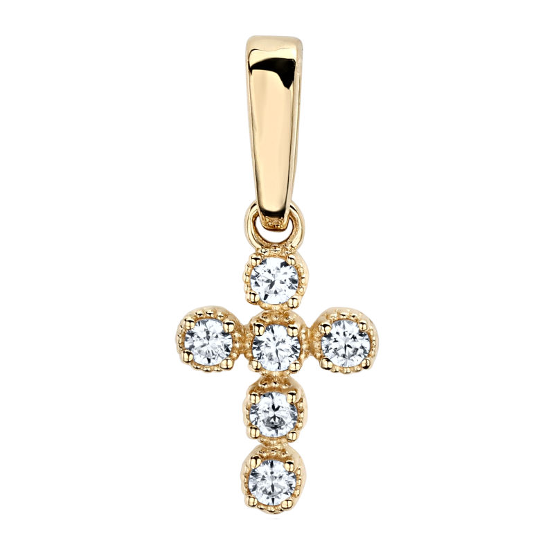 Декоративный крест из желтого золота 585 пробы с фианитами. Декоративные кресты берут начало от нательных. Отличие их в том, что они не имеют религиозной атрибутики. На них нет распятия и молитв. Они имеют более декоративный дизайн или усыпаны вставками. Их носят на виду, поверх одежды.